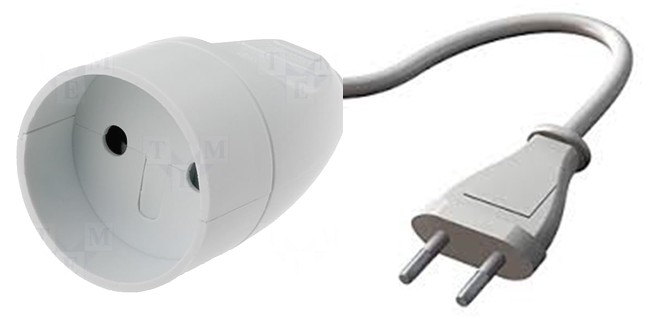 • 250 Volt (AC), max.2.5A, 600 Watt • Snoer: 2x 0,75mm² • Stekker: Platte (Euro-stekker) • Contrastekker: Rond zonder aarde • Lengte: ± 15cm